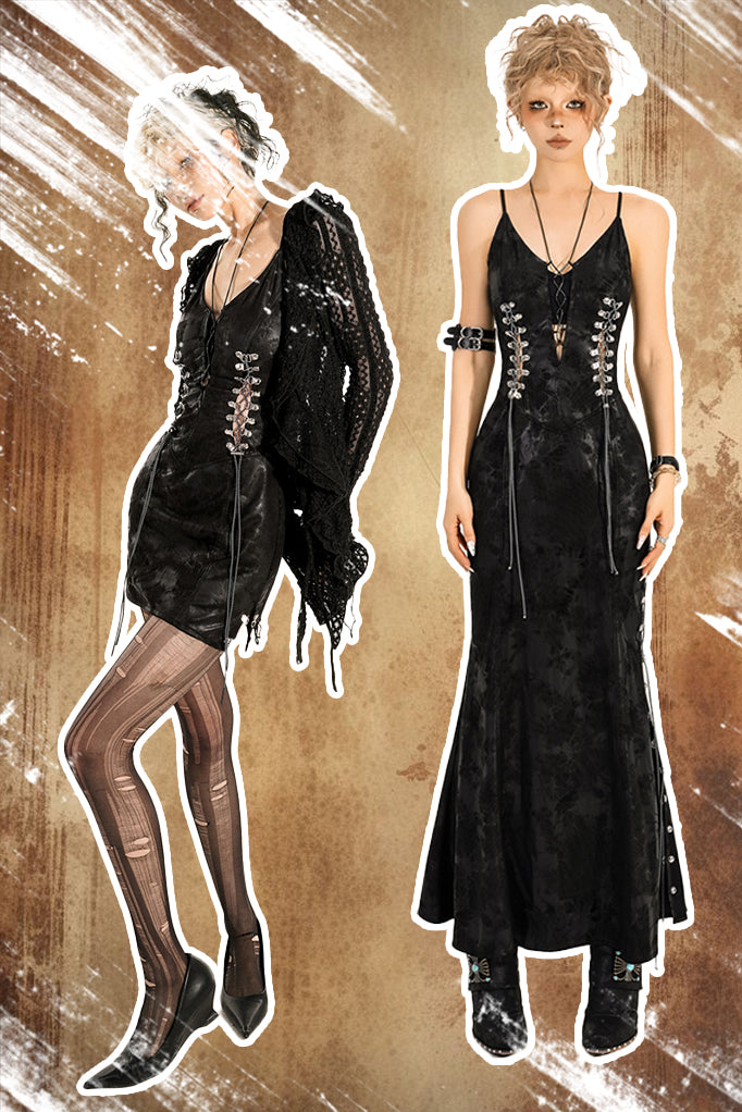Elegance meets edge in this gothic floral suspender dress. Featuring intricate heavy-work embellishments and a luxurious silhouette, it effortlessly transforms from a sultry little black dress to a stunning banquet-ready gown.