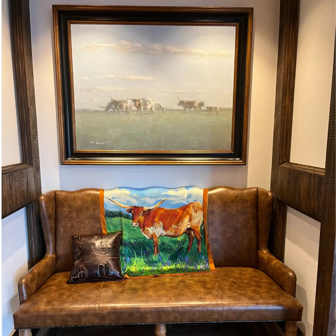 Silk cowboy bandana (Cowtown Calling) When you think of Fort Worth, what do you think of? Longhorns! This bold longhorn is ready for Cowtown. Bold and all the best colors of sienna, brown, blue, green, and red. It is full color on both sides!